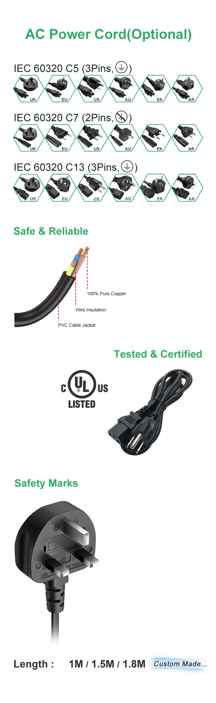 * Plus d'unités pour la série 200 W : 5 V/8V/9V/12V/13,5V/15V/18V/19V/24V/25V/30V/36V/29V/30V/42V/48V disponibles * Sécurité : OCP/OVP/OTP, SCP, coupure automatique de surcharge, coupure de surtension, coupure thermique automatique. * Compatibilités étendues: bandes lumineuses LED, imprimante 3D, émetteur-récepteur radioamateur, caméras de vidéosurveillance, amplificateur de caisson de basses de voiture, amplificateur audio, routeur sans fil, chats ADSL, humidificateur, HUB, clavier, haut-parleur BT, moniteur, webcam, DVR, NVR, alimentation audio/vidéo