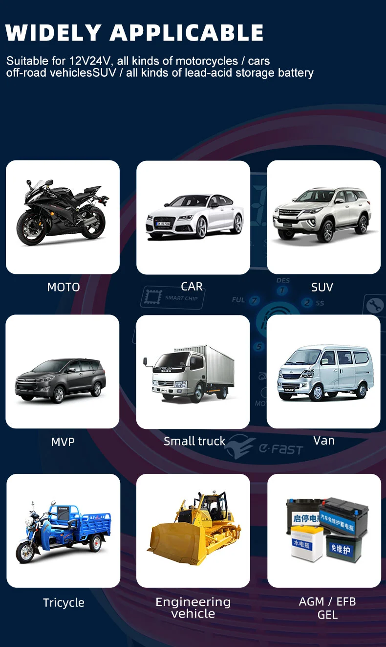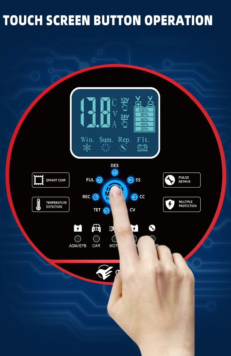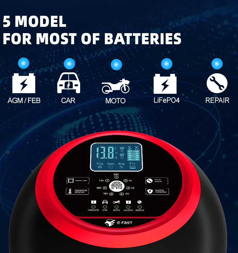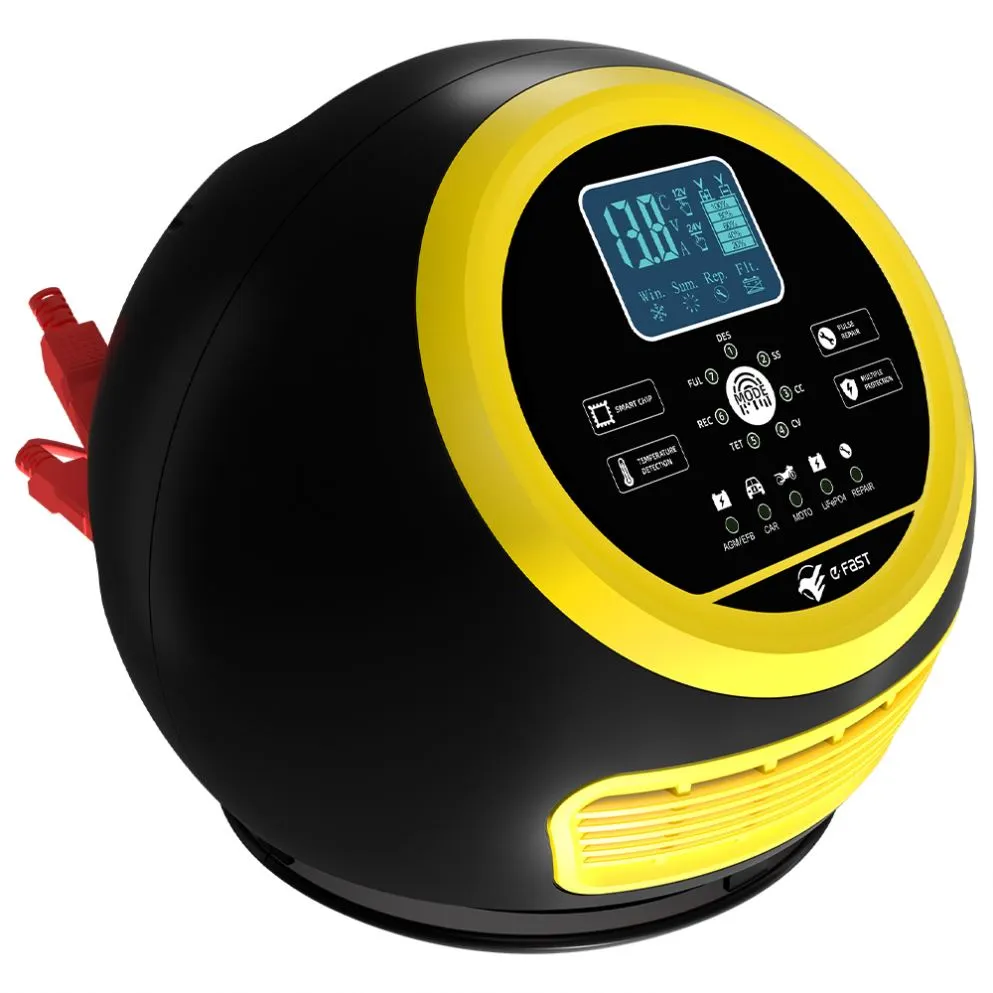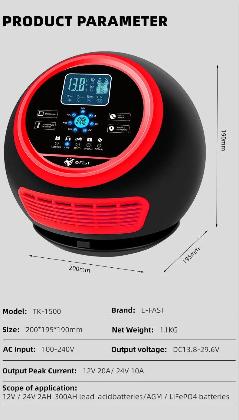 Ce chargeur présente un design compact innovant et est équipé d'un écran LCD haute définition qui affiche la tension, le courant, la température, la progression de la charge et l'état de la batterie en temps réel, rendant le fonctionnement clair en un coup d'œil. Il dispose d'une fonction de réparation d'impulsions intégrée qui peut activer et réparer les batteries vieillissantes, prolongeant ainsi leur durée de vie. En tant que chargeur intelligent entièrement automatique, le TK-1500 prend en charge le fonctionnement « brancher et oublier » : il détecte automatiquement la tension de la batterie, sélectionne le mode de charge et passe en mode de maintenance de charge flottante après une charge complète pour éviter une surcharge. Il est idéal pour l'entretien des batteries des véhicules stationnés pendant de longues périodes ou des équipements saisonniers tels que les tondeuses à gazon et les bateaux.