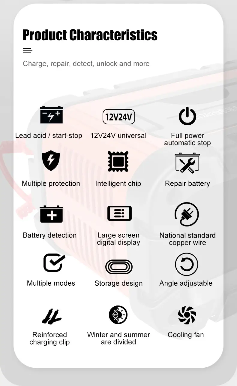 · Détection automatique intelligente : identifie automatiquement le type de batterie et applique le mode de charge correct