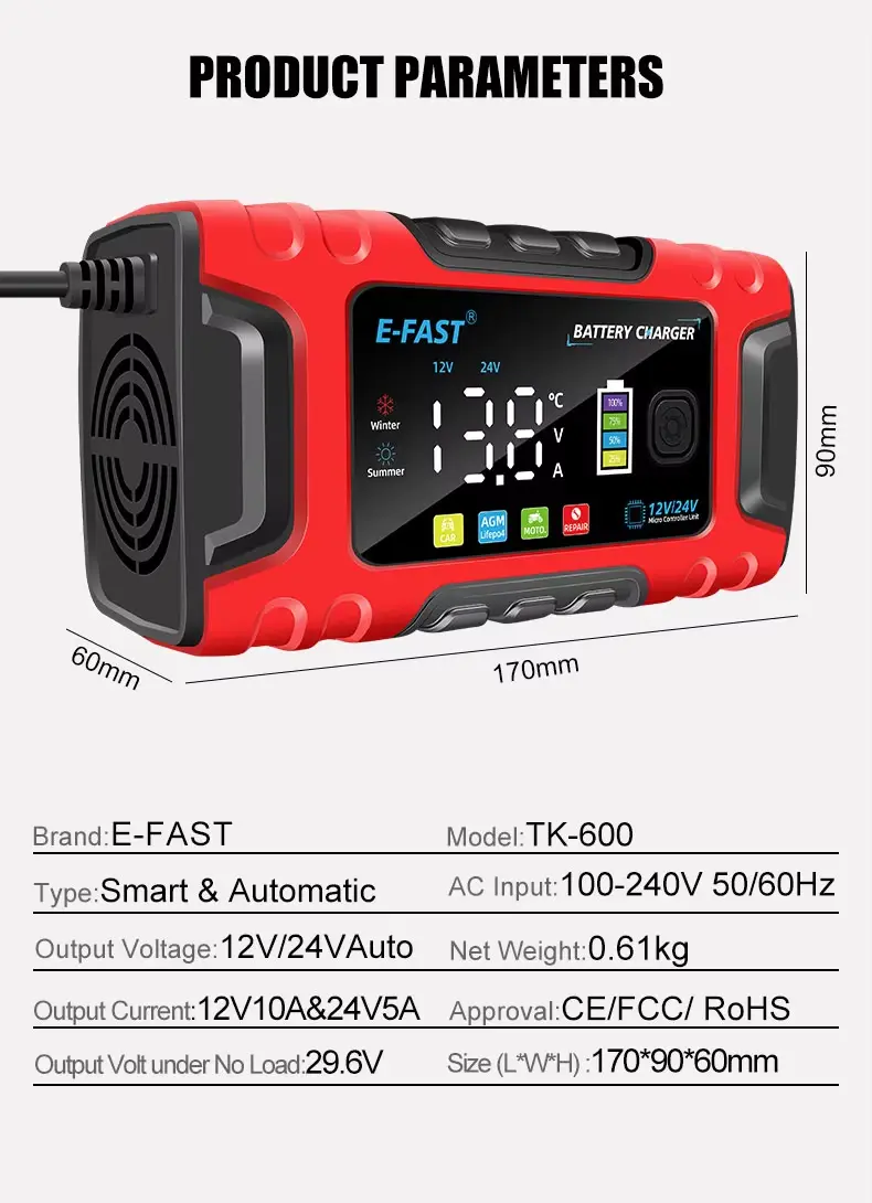 E-Fast TK-600 de haute qualité entièrement automatique avec technologie de réparation d'impulsions, chargeur de batterie au plomb lifepo4 12V10A 24V5A pour voiture |